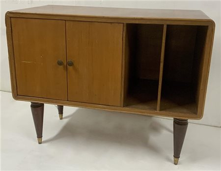 Mobiletto a due ante e due vani in legno impiallacciato, gambe rastremate con piedini in ottone. Italia, anni '50. (cm 81x65x39,5) (difetti e mancanze)