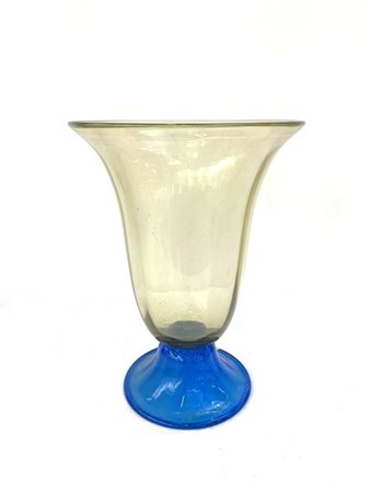 Grande vaso in vetro soffiato trasparente pagliesco con base applicata a caldo in vetro soffiato trasparente azzurrino. Italia, seconda metà secolo XX. (h cm 41; d cm 30,5) (lievi difetti)