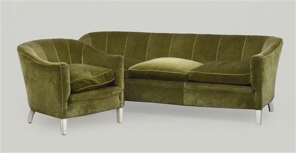 Salotto composto da un divano a tre posti e una poltrona imbottiti e rivestiti in velluto verde con piedini in legno verniciato bianco. Italia, anni '40. (divano cm 210x73x76; poltrona cm 73x73x67) (lievi difetti e restauri)