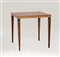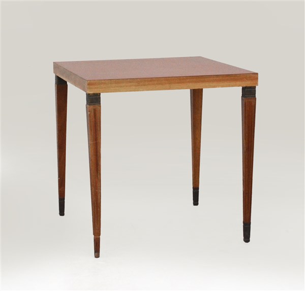 Tavolo in legno massello e impiallacciato con piano rivestito in laminato. Gambe rastremate con inserti in ottone; giunzioni del piano alle gambe e puntali in ottone. Italia, anni '50. (cm 80x80,5x80) (difetti e mancanze)