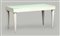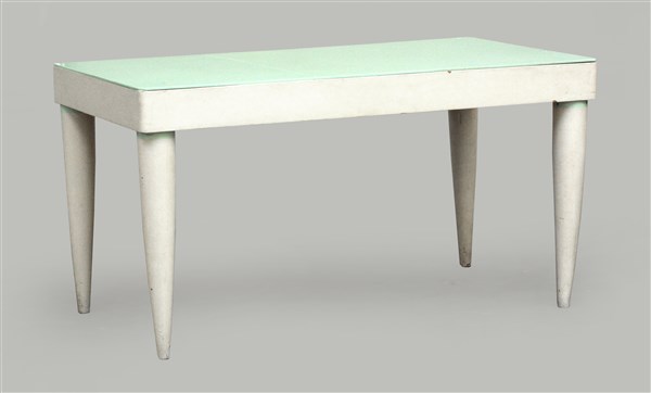 Tavolo in legno verniciato bianco con piano in opalina verde acqua. Italia, produzione recente. (cm 151,5x79,5x80,5) (gravi difetti)