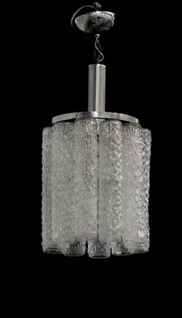 Lampada a sospensione con pendenti cilindrici in vetro cristallo stampato e struttura in acciaio. Italia, anni '70/'80. (lievi difetti)