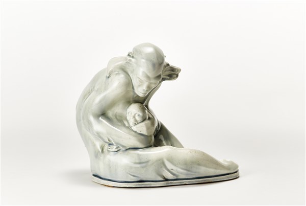 Scultura Art Déco raffigurante una scimmia con il piccolo tra le braccia. Italia, anni '20/'30. Porcellana formata a colaggio e smaltata a colature in celeste sfumato sotto vetrina. Firma per esteso al retro. (cm 26x22x15) (difetti)