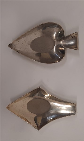 Lotto composto da due posaceneri in metallo argentato raffiguranti i semi delle carte. Italia, anni '70. Marcati sotto la base. (misure diverse)