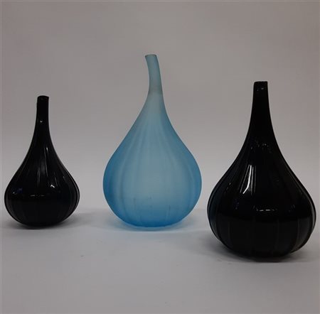 Lotto composto da tre vasi soliflore della serie "Drops". Murano, produzione recente. Vetro acidato acquamare e nero. Firmati e datati all'acido e a punta sotto la base. Esemplare più alto in scatola originale. (h max cm 28)