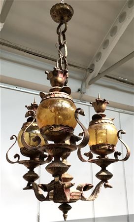 Grande lampadario a tre luci in ferro battuto dorato e verniciato rosso con diffusori in vetro soffiato pagliesco con inclusione di bolle. Milano-Murano, anni '20. (h cm 135) (lievi difetti)