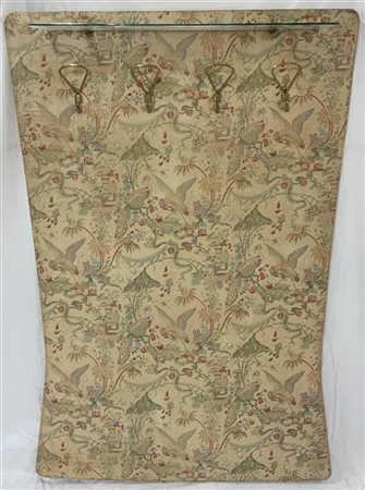 Attaccapanni da parete con pannello in tessuto con quattro appendiabiti in ottone e mensola in cristallo molato. Italia, anni '70. (cm 118x174) (difetti)