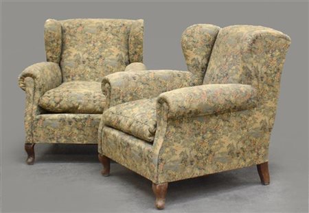 Coppia di poltrone imbottite e rivestite in tessuto a motivi vegetali, piedini in legno. Italia, anni '50. (cm 85x90x80) (difetti)