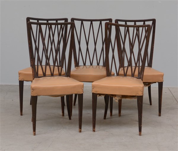 Lotto composto da cinque sedie con struttura in legno laccato marrone scuro, seduta imbottita e rivestita in finta pelle beige. Italia, anni '40. (cm 46x96x48) (difetti)