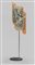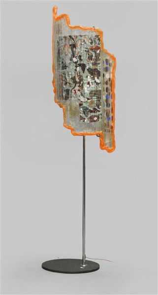 Lampada da terra con base verniciata ghisa, fusto in metallo con paralume in resina policroma con inclusione di scampoli di tessuto modello "Jacopo ²". Italia, secolo XXI. Recante etichetta metallo ETRO titolata e numerata. (h cm 190) (difetti)