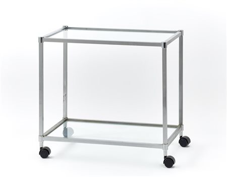 Carrello a due ripiani. Bregnano, anni '80. Struttura in metallo cromato e piani in cristallo. (cm 72x65x42) (difetti)