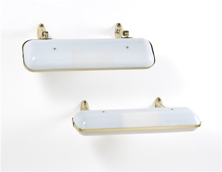 * Pair of wall lamps. Milan, 1957. Structure in brass-plated cast aluminum, opaque white methacrylate diffuser. (l 73 cm.) (slight defects)