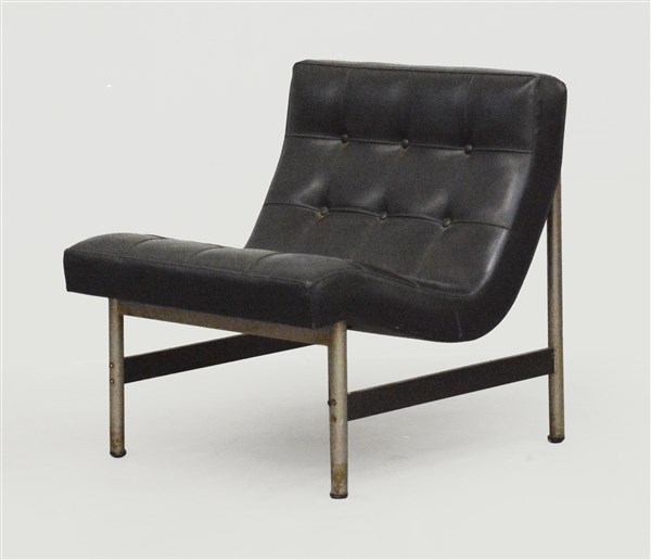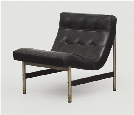 Poltroncina. Produzione ICF, Italia, anni '70. Struttura in metallo cromato e verniciato nero, rivestimento in skai nero. (cm 65x71x6) (lievi difetti)