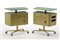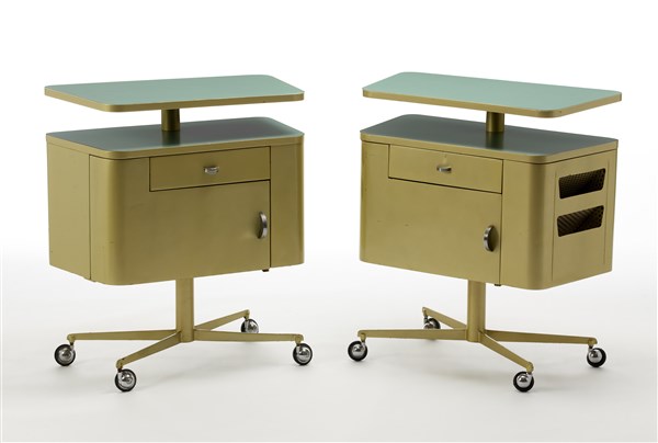 * Lotto di due comodini su ruote ad un cassetto, un'anta, due ripiani a giorno e una tasca porta riviste su un lato. Produzione Officine Valsecchi, Milano, 1957. Acciaio stampato e verniciato color verde metallizzato, piani rivestiti in formica verdina, bordure in alluminio ottonato. (cm 66x74,5x35,5) (lievi difetti)