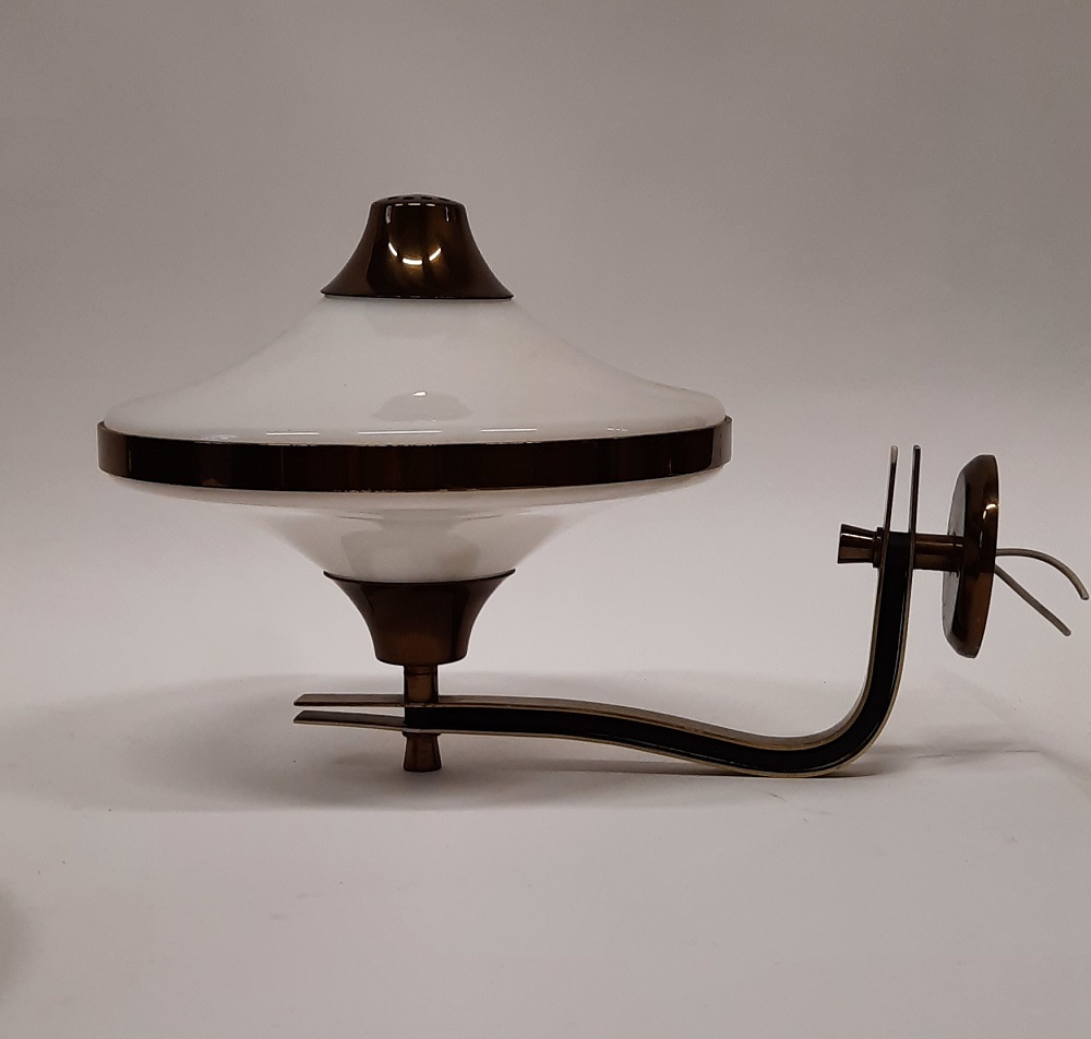 Lampada da parete con struttura in ottone e paralumi in metacrilato opalino. It