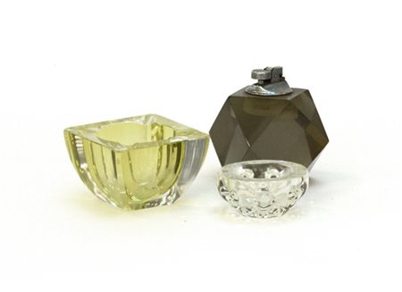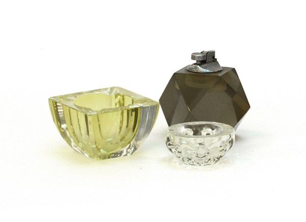 Lotto composto da un accendino in plexiglass trasparente verdino unito a due posaceneri di diversa manifattura in vetro. Italia & Francia, secolo XX. (misure diverse) (difetti)