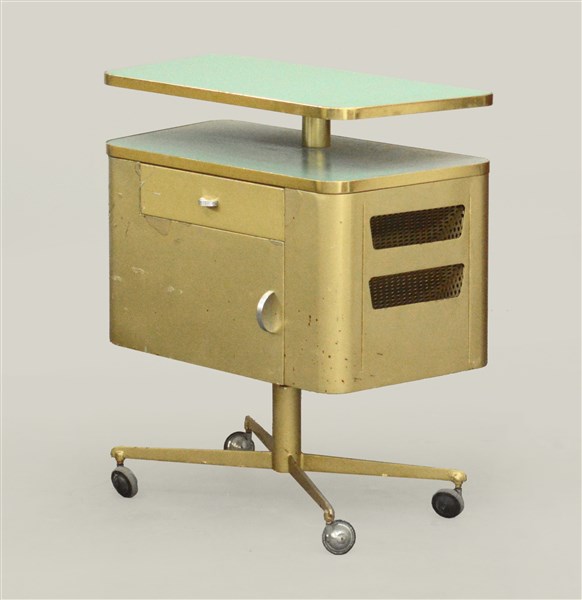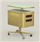 * Comodino su ruote ad un cassetto, un'anta, due ripiani a giorno e una tasca porta riviste su un lato. Produzione Officine Valsecchi, Milano, 1957. Acciaio stampato e verniciato color verde metallizzato, piani rivestiti in formica verdina, bordure in alluminio ottonato. (cm 66x74,5x35,5) (difetti)