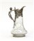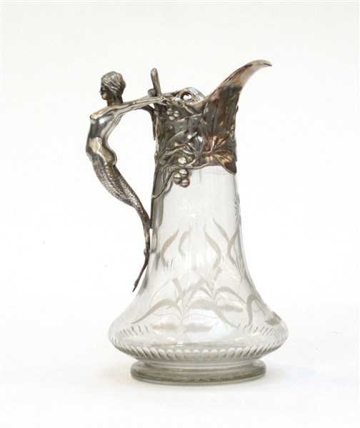 Versatoio con corpo in vetro inciso alla mola raffigurante fiori, ghiera in peltro argentato inciso a rami con frutti e con presa a tutto tondo raffigurante sirena. Italia, anni '20ca. (h cm 30,5) (difetti)