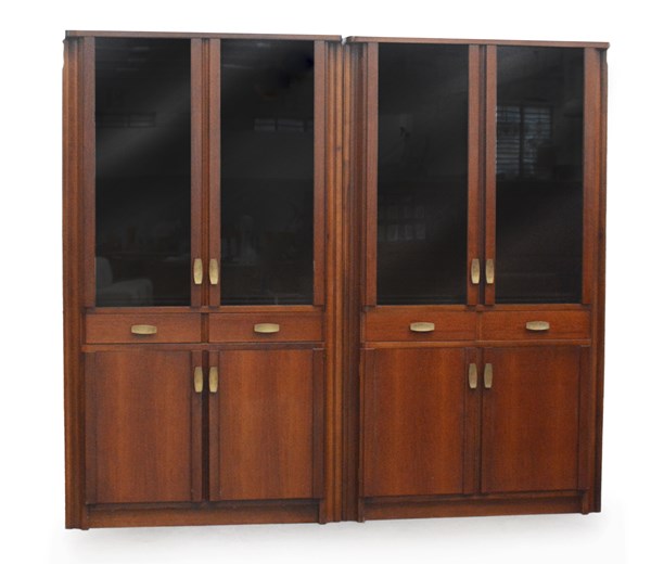 Coppia di librerie con parte inferiore a due ante, parte centrale con due cassetti e parte superiore con due sportelli vetrina in vetro fumè. Maniglie in ottone. Italia, anni '70. (cm 110x193x47) (lievi difetti)