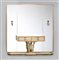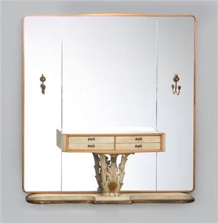 Consolle a quattro cassettini con rivestimento in pergamena e piano a specchio. Specchiera tripartita a due luci laterali in ottone. Cornice in legno di acero, basamento in ottone e pergamena. Cantù, anni '30/'40. (cm 173x185x38) (lievi difetti)
