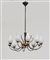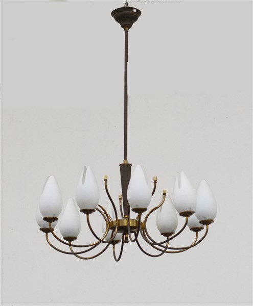 Lampada a sospensione a dieci luci con struttura in ottone, diffusori in vetro lattimo acidato sulla superficie esterna. Italia, anni '50. (h cm 94; d cm 72)