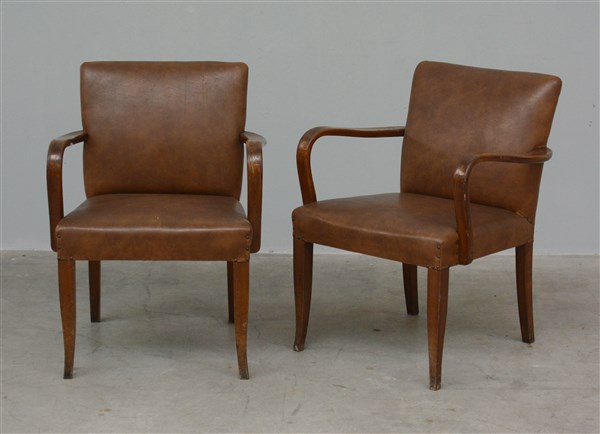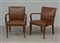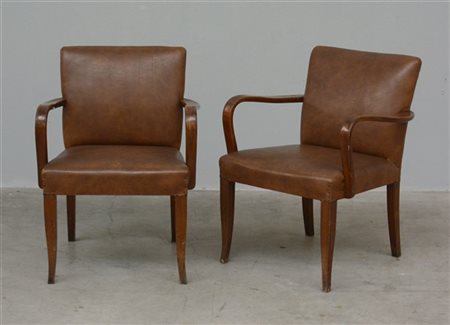 Lotto composto da due poltrone con struttura in legno, seduta e schienale imbottiti e rivestiti in pelle marrone. Italia, anni '40. (cm 61x80x55) (lievi difetti e piccoli restauri)