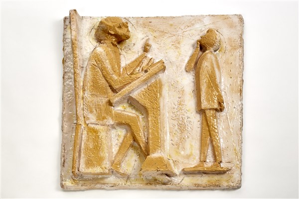 Angelo Biancini "Esame di riparazione" Pannello in terracotta decorata a rilievo