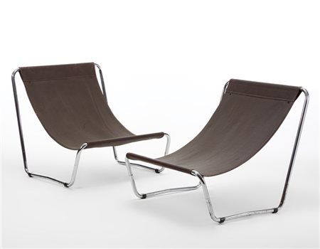 Coppia di poltrone con struttura in acciaio cromato, seduta in vinilpelle. (cm 77x73x70) (difetti e piccole mancanze)