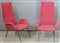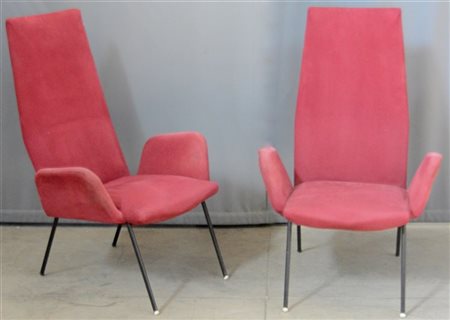 Coppia di poltroncine da camera imbottite e rivestite in tessuto ciclamino struttura in metallo rivestita in plastica nera. Italia, anni '50/'60. (cm 68x99x71) (difetti)