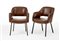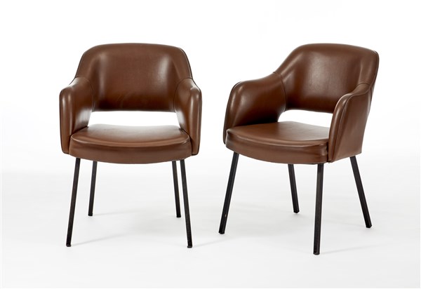 Coppia di poltroncine con struttura in ferro, seduta e schienale imbottiti e rivestiti in skai marrone. Italia, anni '60. (cm 57x80x60) (lievi difetti)
