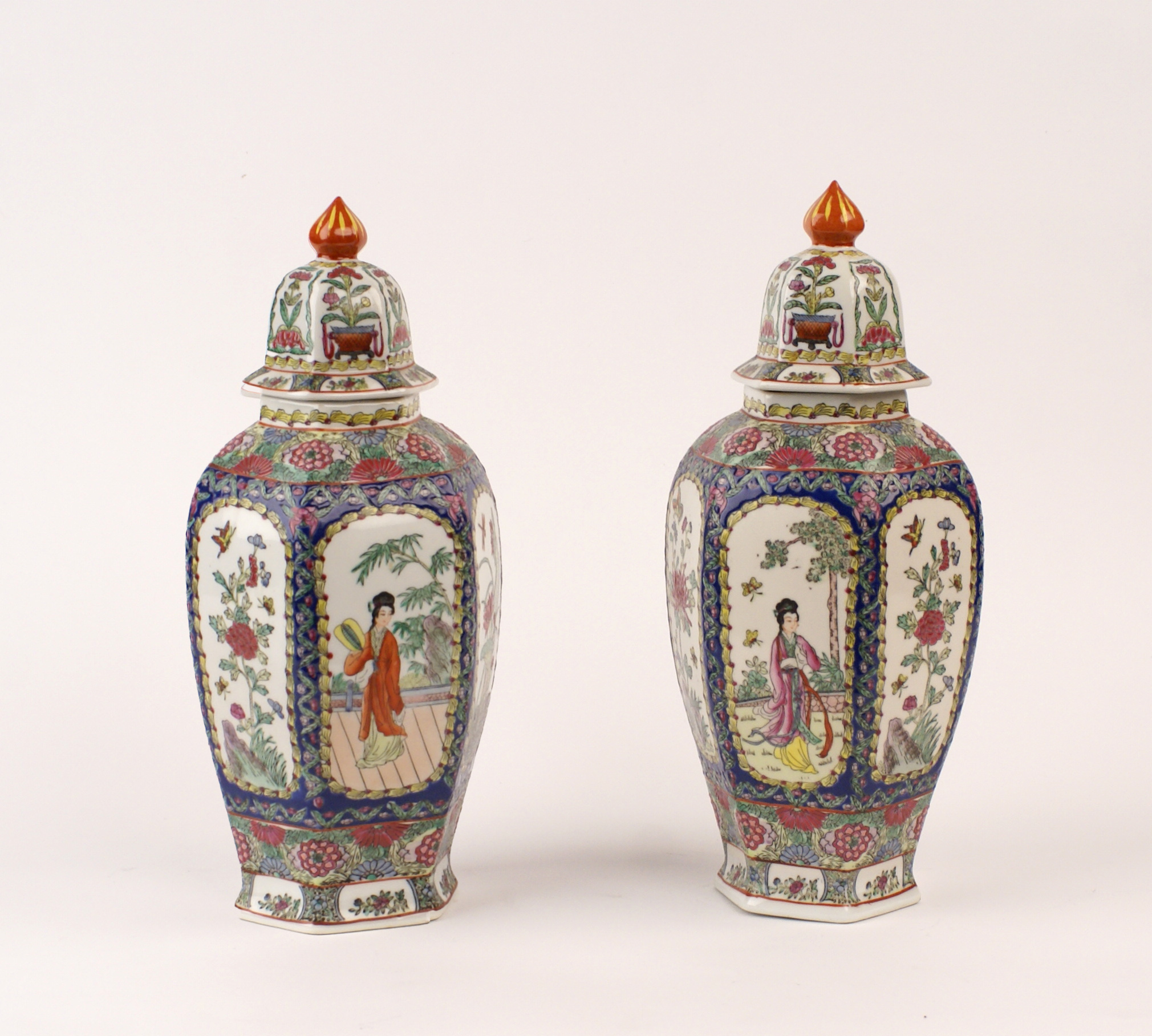 COPPIA DI POTICHE IN CERAMICA SMALTATA Cina, vecchia manifattura di linea esagonale, dipinte in policromia con figure femminile e motivi floreali entro cornici sagomate h. 33 cm.