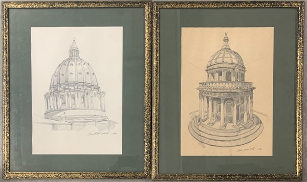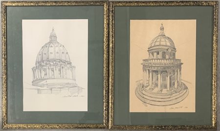 Coppia di disegni a matita raffiguranti la Cupola di San Pietro e il tempietto di San Pietro in Montorio a Roma. Firmati e datati in basso a destra. (fogli cm 46x33). In cornici. (lievi difetti)