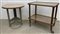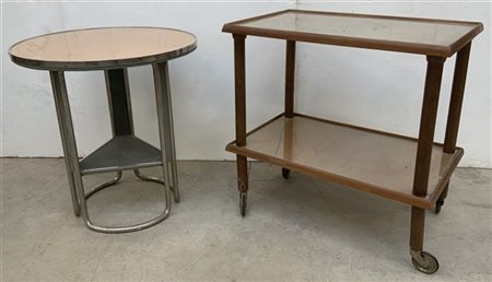 Lotto composto da un tavolino con struttura cromata e piano a specchio di forma circolare unito a un carrello portavivande in legno a due ripiani in vetro. Italia, secolo XX. (tavolino cm h cm 63,5, d cm 60,5; carrellino cm 68,5x9x42) (difetti)
