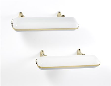 * Pair of wall lamps. Milan, 1957. Structure in brass-plated cast aluminum, opaque white methacrylate diffuser. (l 73 cm.) (slight defects)