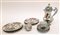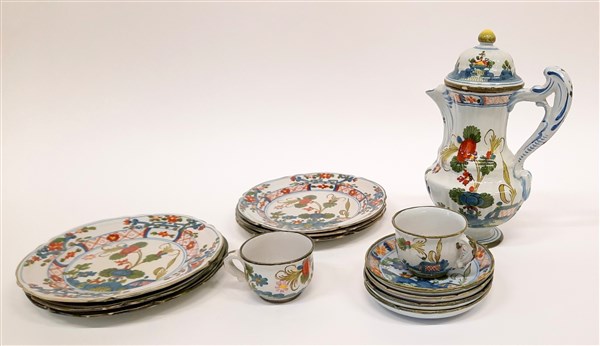 Parte di servizio da te in ceramica dipinta composto da una teiera, due tazzine e dieci piattini di due diverse dimensioni. Prima metà secolo XX. (difetti)