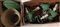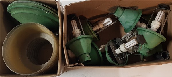 Gruppo di otto lampade da giardino modello "1203MK". Italia, anni '70. Fusione di alluminio pressofuso verniciato verde, paralume in metacrilato. (h cm 37) (gravi difetti)