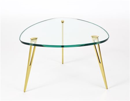 Tavolino da salotto tripode con gambe in ottone e piano in cristallo di forte s