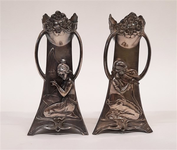 Coppia di candelieri in peltro argentato decorato con motivi liberty a fiori e suonatrici. Austria, secolo XIX/XX. (h cm 17) (lievi difetti)