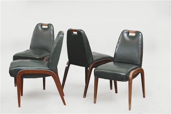 Lotto composto da quattro sedie con rivestimento in skai verde, gambe in legno massello sagomato. Italia, anni '50. (cm 45,5x82x65) (difetti)