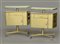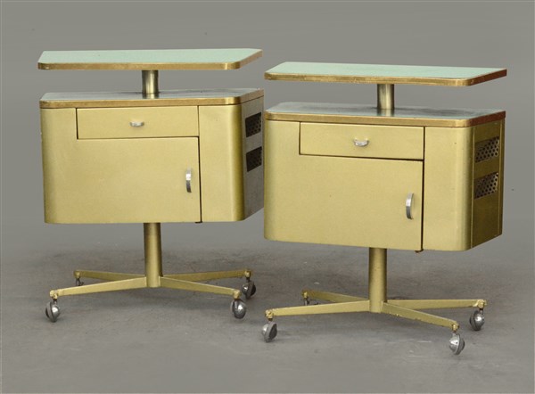* Lotto di due comodini su ruote ad un cassetto, un'anta, due ripiani a giorno e una tasca porta riviste su un lato. Produzione Officine Valsecchi, Milano, 1957. Acciaio stampato e verniciato color verde metallizzato, piani rivestiti in formica verdina, bordure in alluminio ottonato. (cm 66x74,5x35,5) (difetti e mancanze)