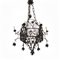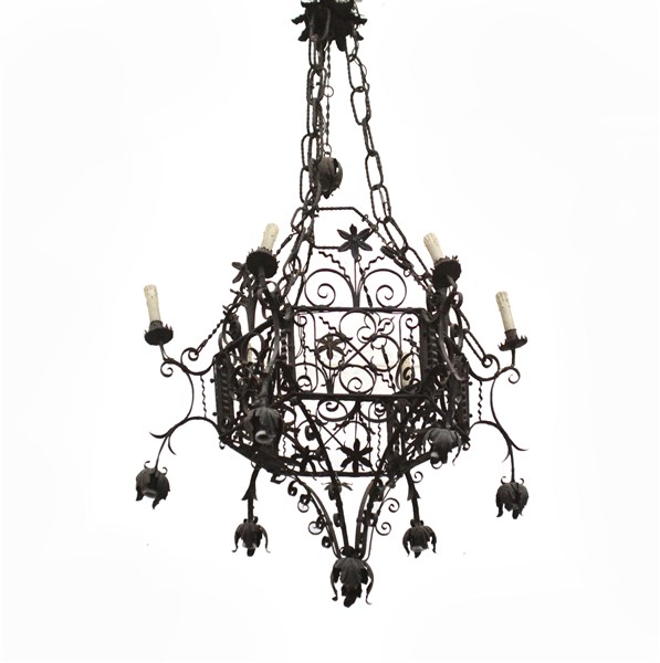 Lampada a sospensione a tredici fiamme in ferro battuto e decorato a fiori e vo