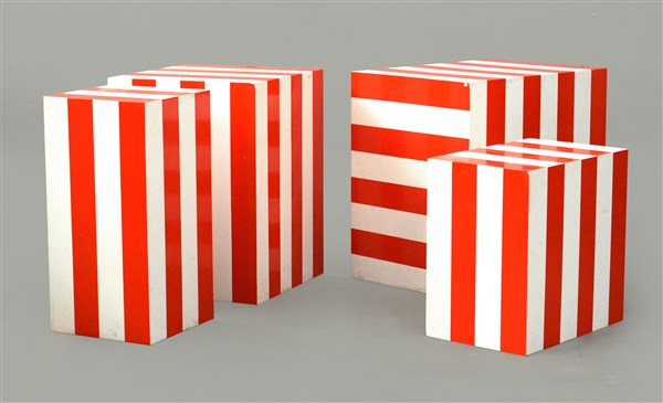 Lotto composto da quattro cubi in legno dipinti bianco con fasce adesive rosse. Seconda metà secolo XX. (misure diverse) (difetti)