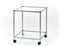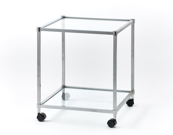 Carrello/comodino a due ripiani. Bregnano, anni '80. Struttura in metallo cromato e piani in cristallo. (cm 57x65x57) (difetti)
