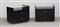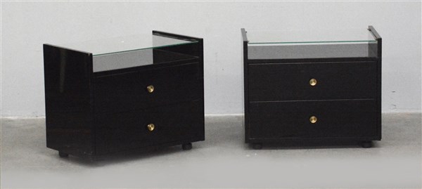 Coppia di comodini. Produzione Sormani, Italia, anni '60. Legno laccato nero a due cassetti con pomolo in ottone, piano superiore in cristallo molato. (cm 60,5x50x36) (difetti)