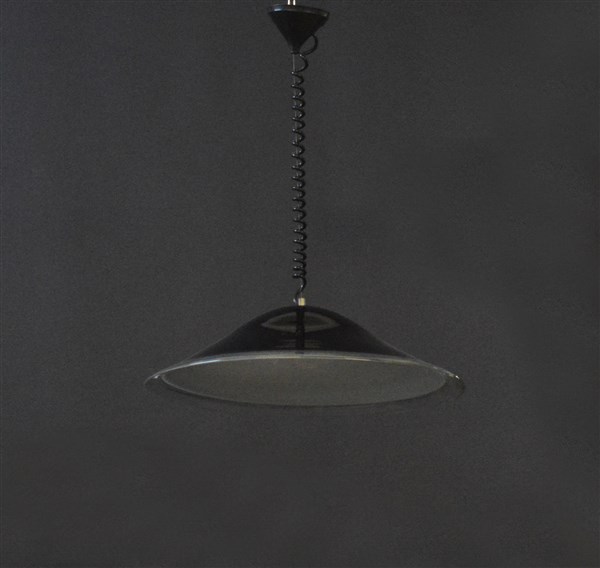 Lampada a sospensione modello "Melaina". Produzione Leucos, Murano, 1968. Vetro nero all'esterno e bianco all'interno; fascia in vetro cristallo sul bordo. (altezza regolabile, d cm 63)
