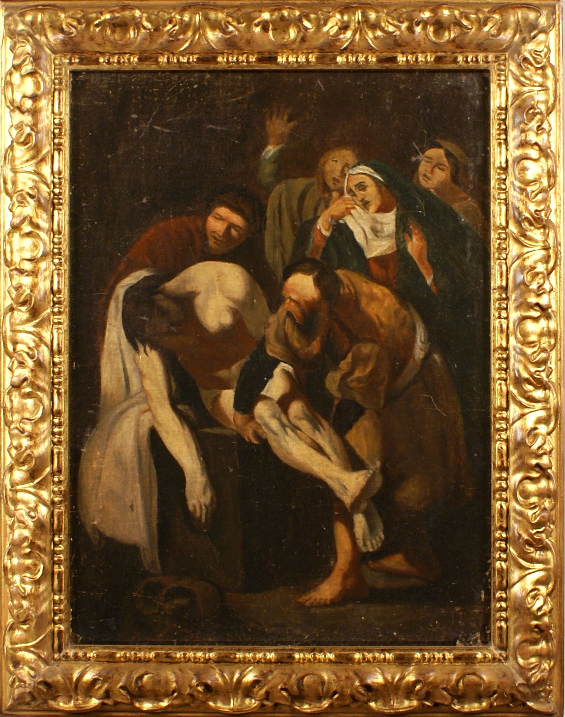 SCUOLA ITALIANA XIX Sec. La deposizione di Cristo, olio su tela, entro cornice in legno dorato 60x44 cm.