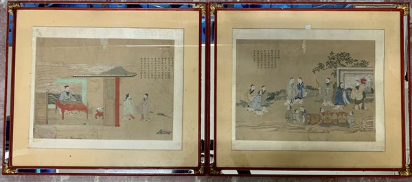 Coppia di antichi dipinti su carta raffiguranti scene di palazzo e recanti iscrizioni, in cornice a specchio (difetti)