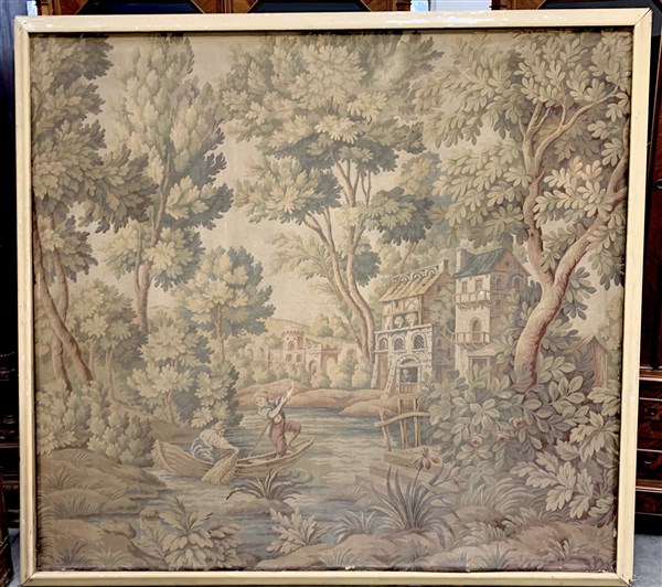 Arazzo meccanico tipo Gobelin, Francia, secolo XX. Raffigurante architetture in riva a un lago con pescatori. (cm 190x174)(Difetti)