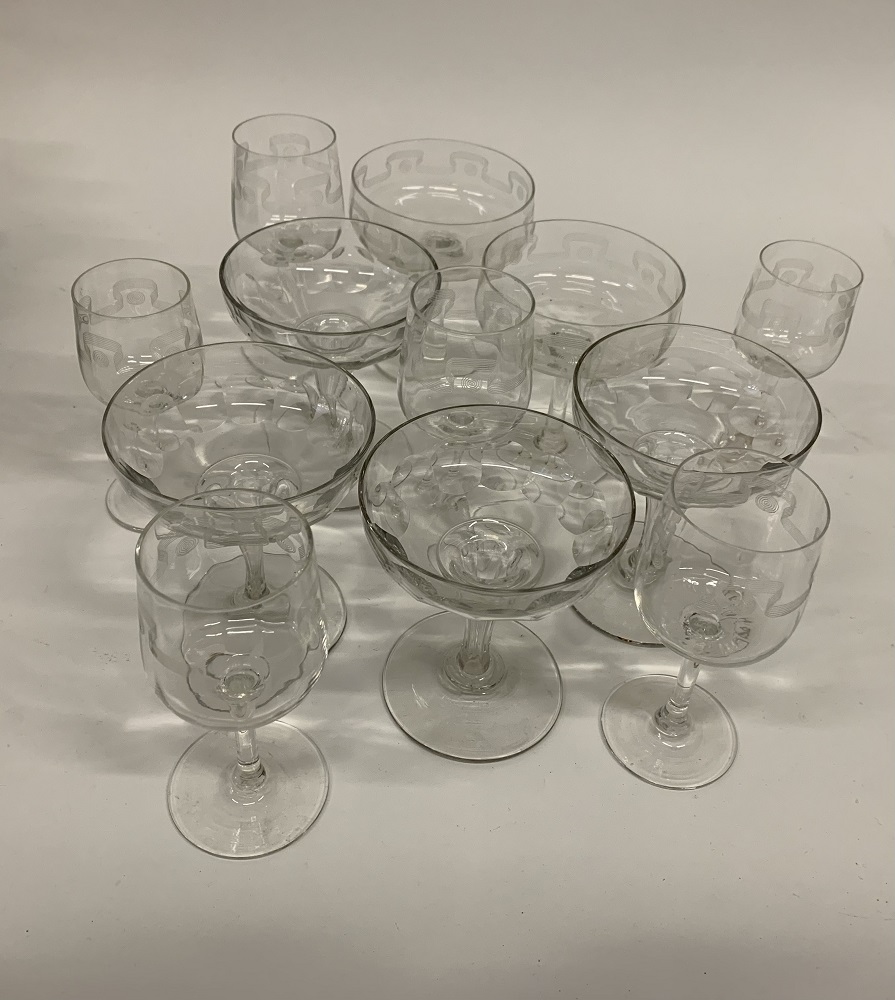 Cartone contenente parti di servizi di bicchieri e coppe in vetro uniti a due bottiglie con tappi e decori dorati (difetti)