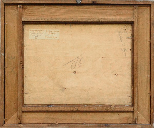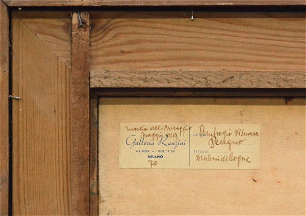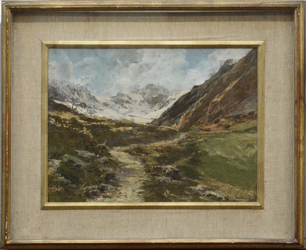 "D'intorni di Cogne" olio su compensato (cm 33x44) Firmato in basso a destra. Al retro: cartiglio della Mostra del Paesaggio maggio 1949, Galleria Ranzini Milano. In cornice